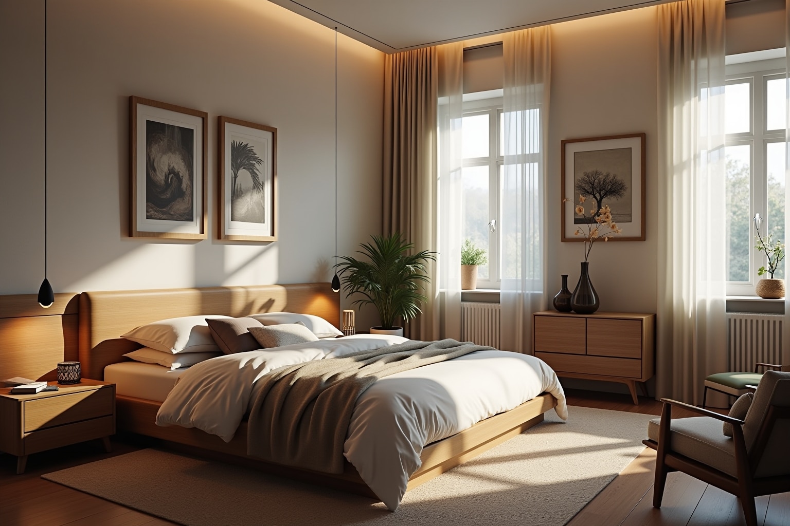 Zimmerpflanzen bringen nicht nur Farbe und Leben in den Raum, sondern verbessern auch die Luftqualität. Wähle pflegeleichte Pflanzen, die für Schlafzimmer geeignet sind, wie zum Beispiel Bogenhanf, Efeutute oder Grünlilie. Platziere sie in schönen Übertöpfen auf Nachttischen, Regalen oder dem Boden. Hängende Pflanzen können ebenfalls einen schönen Akzent setzen und den Raum optisch auflockern.