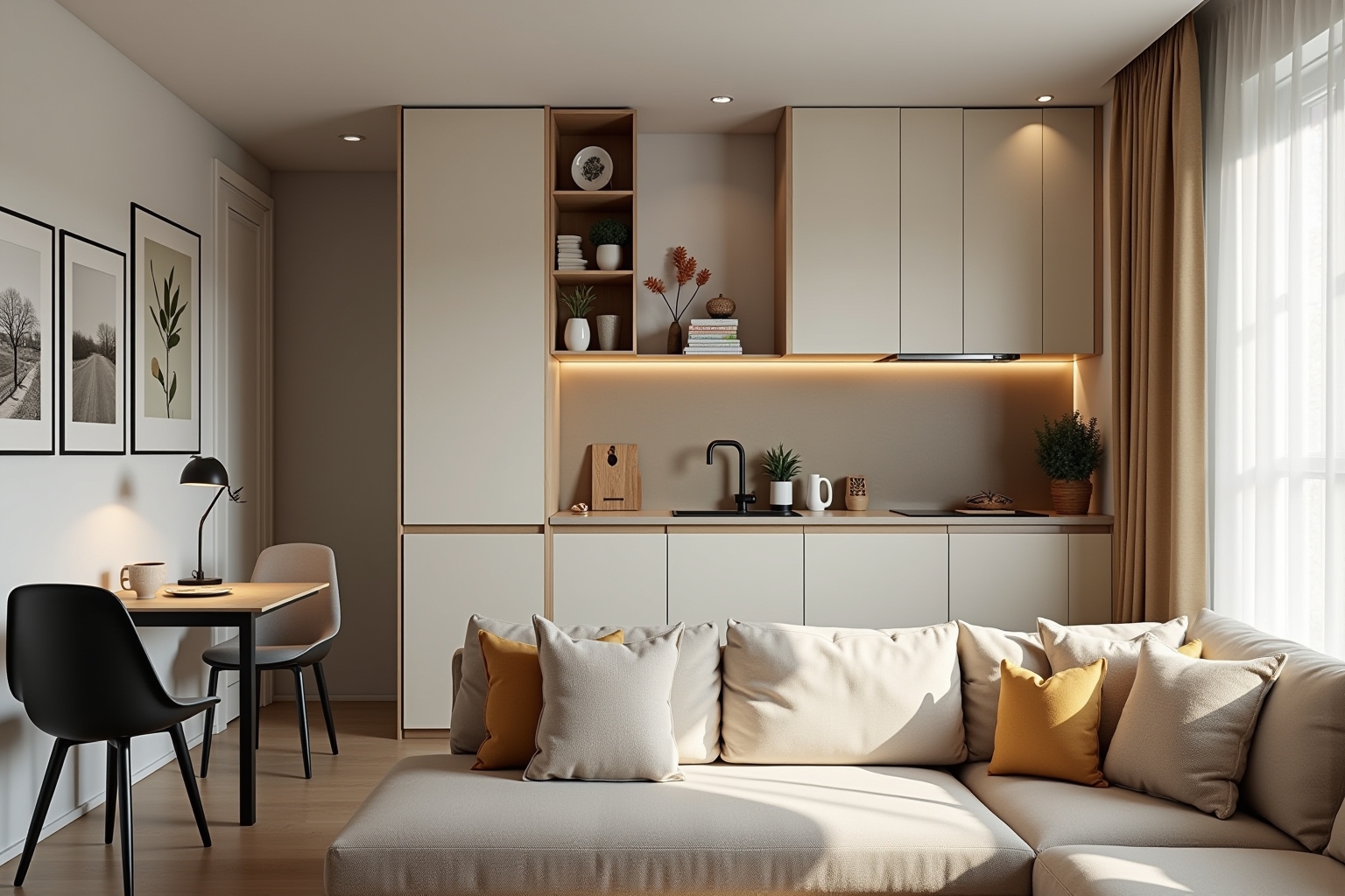- Zonen definieren: Auch in einem einzigen Raum kannst du durch Möbelplatzierung, Teppiche oder unterschiedliche Beleuchtung verschiedene Funktionsbereiche schaffen. Ein Wohnbereich, ein Arbeitsplatz und ein Essbereich lassen sich so klar voneinander abgrenzen.
